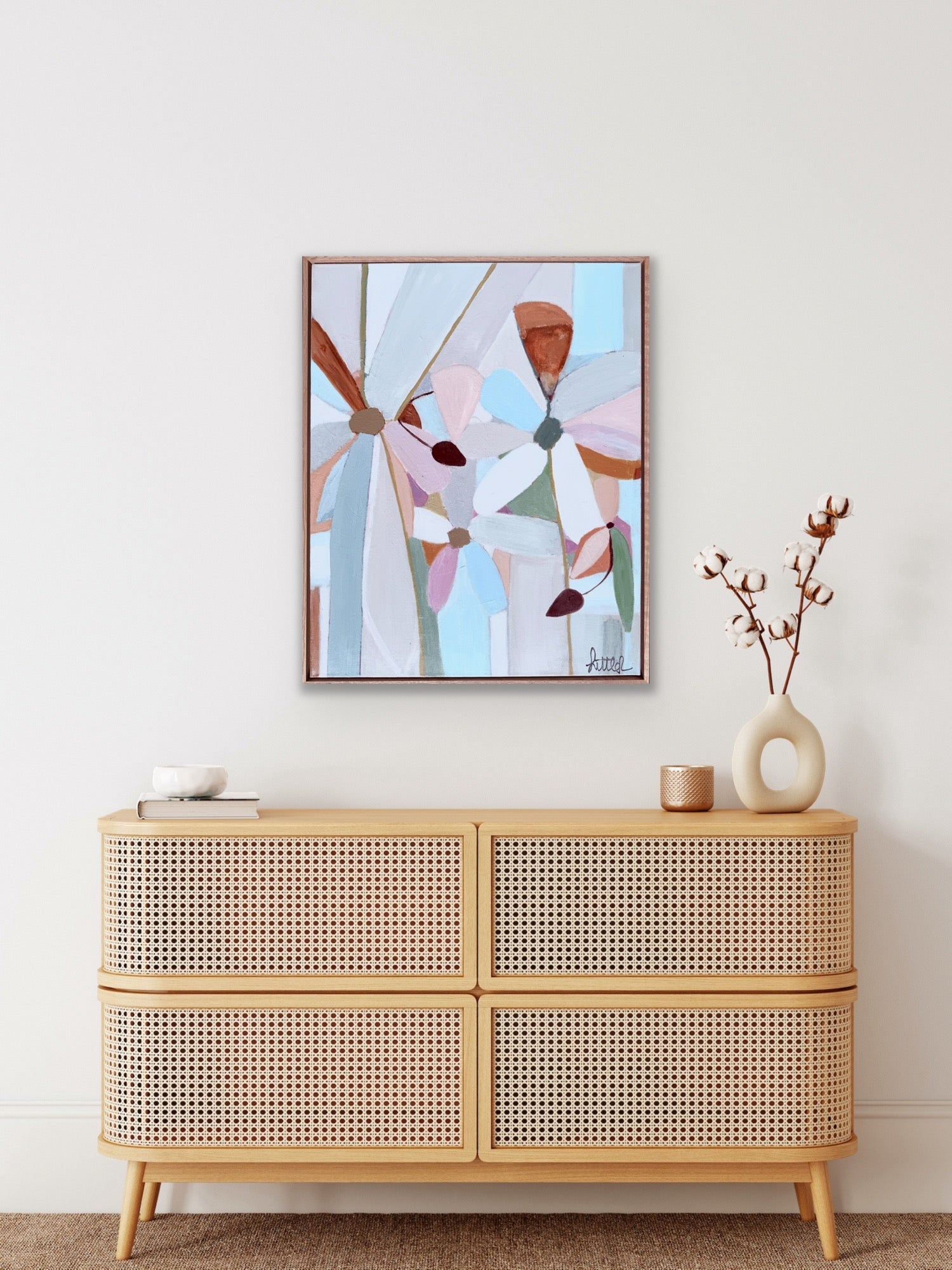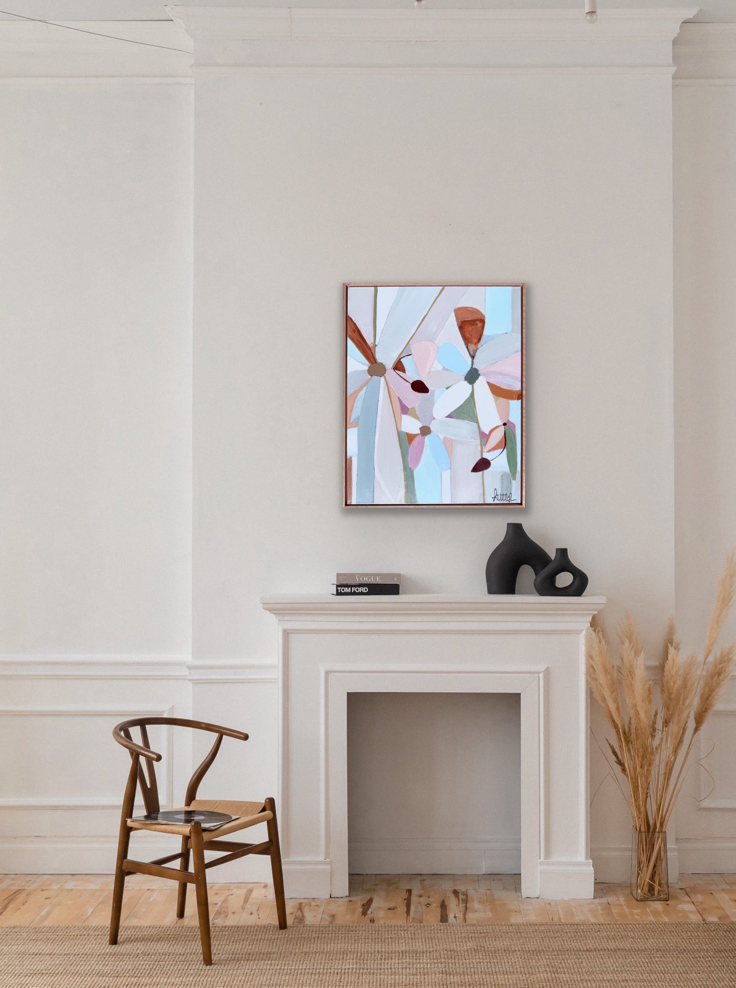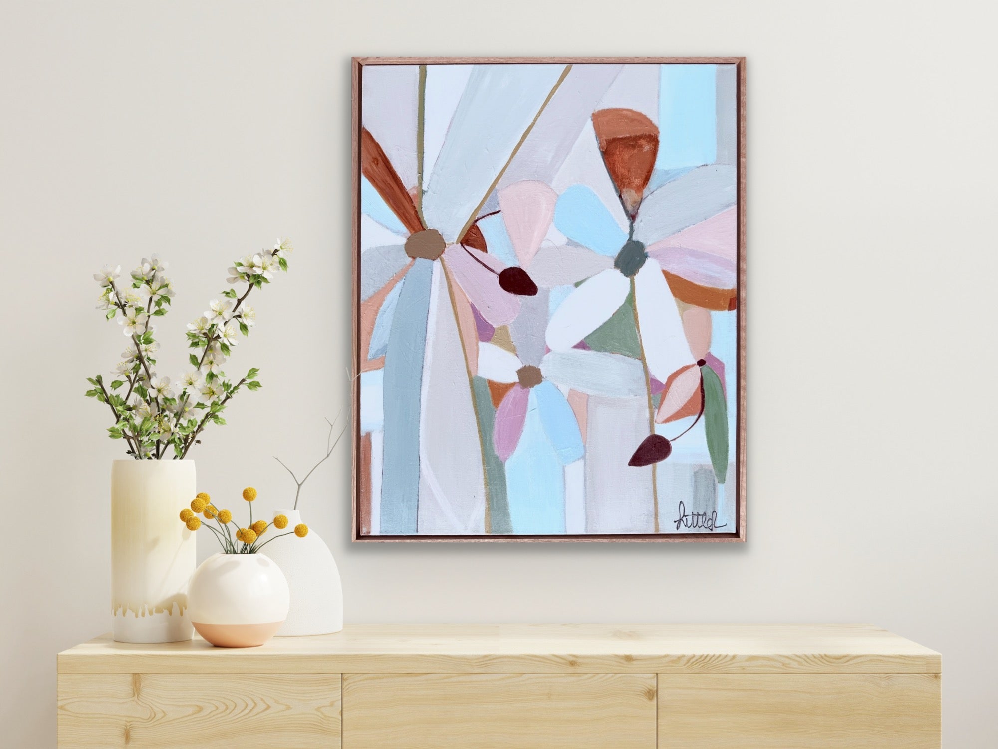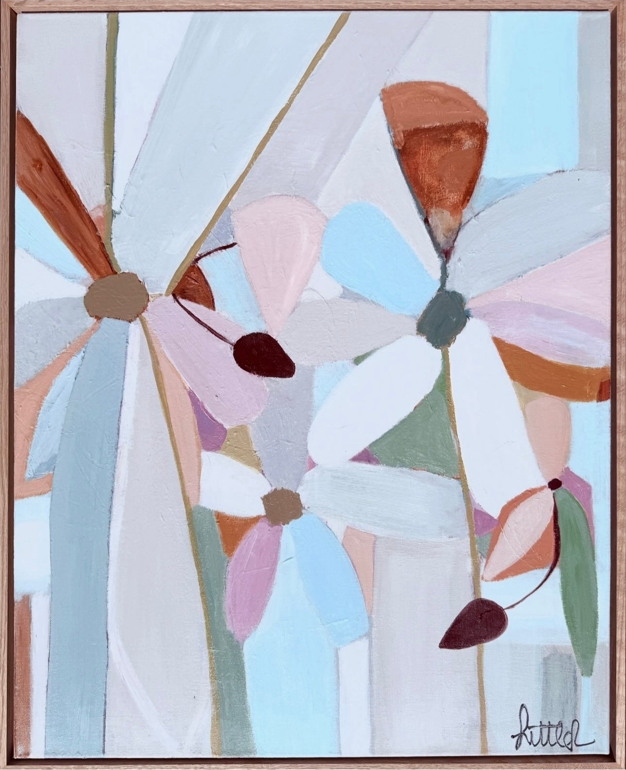 This captivating abstract floral painting presents a harmonious blend of soft pastels and earthy tones. The brushwork creates a dynamic interplay of shapes and colours, evoking a sense of gentle movement and tranquility. The subtle contrasts and fluid forms invite the viewer to explore the delicate balance between nature and abstraction. Perfect for adding a touch of elegance and serenity to any space, this piece is a timeless addition to your art collection.