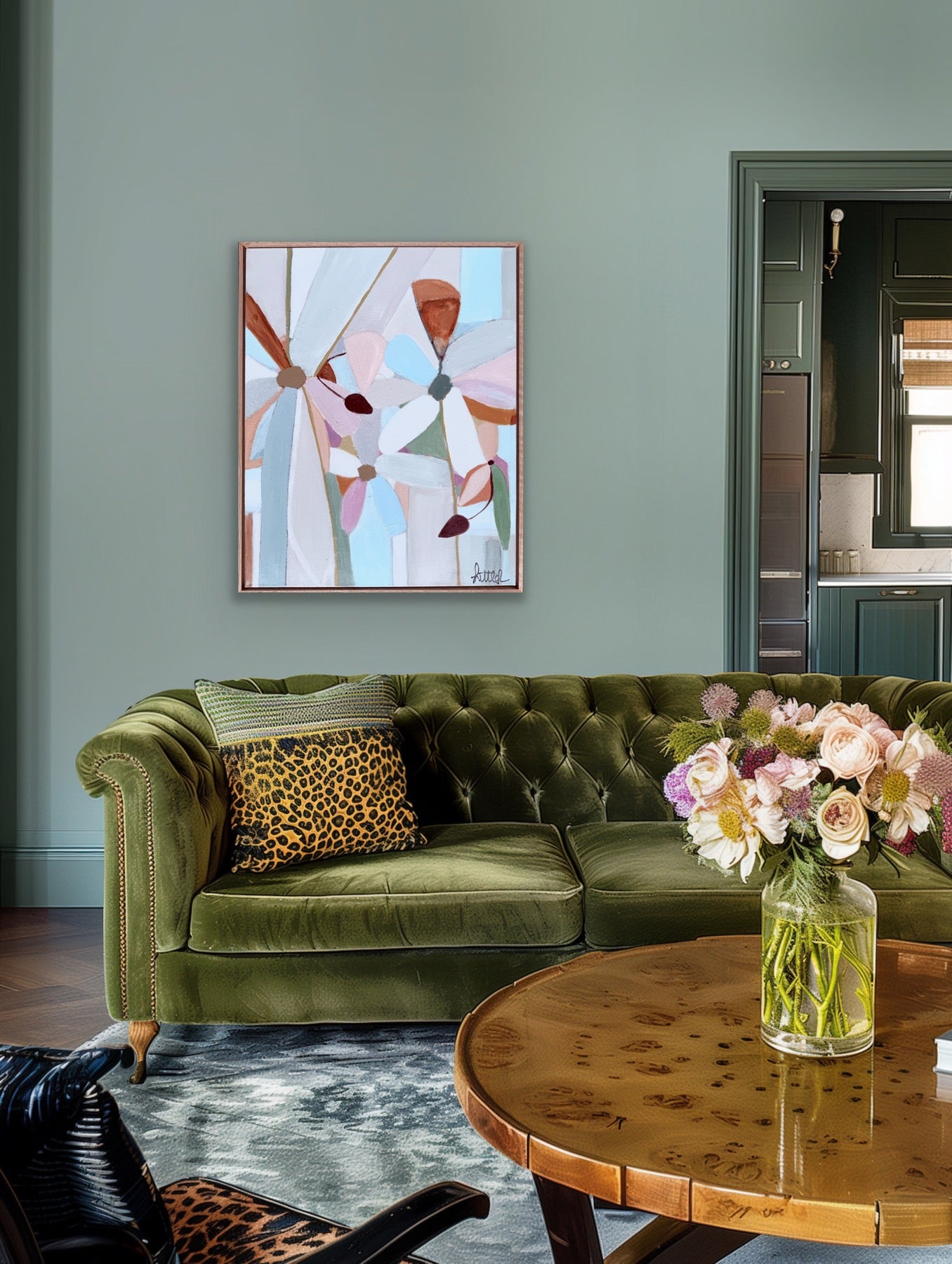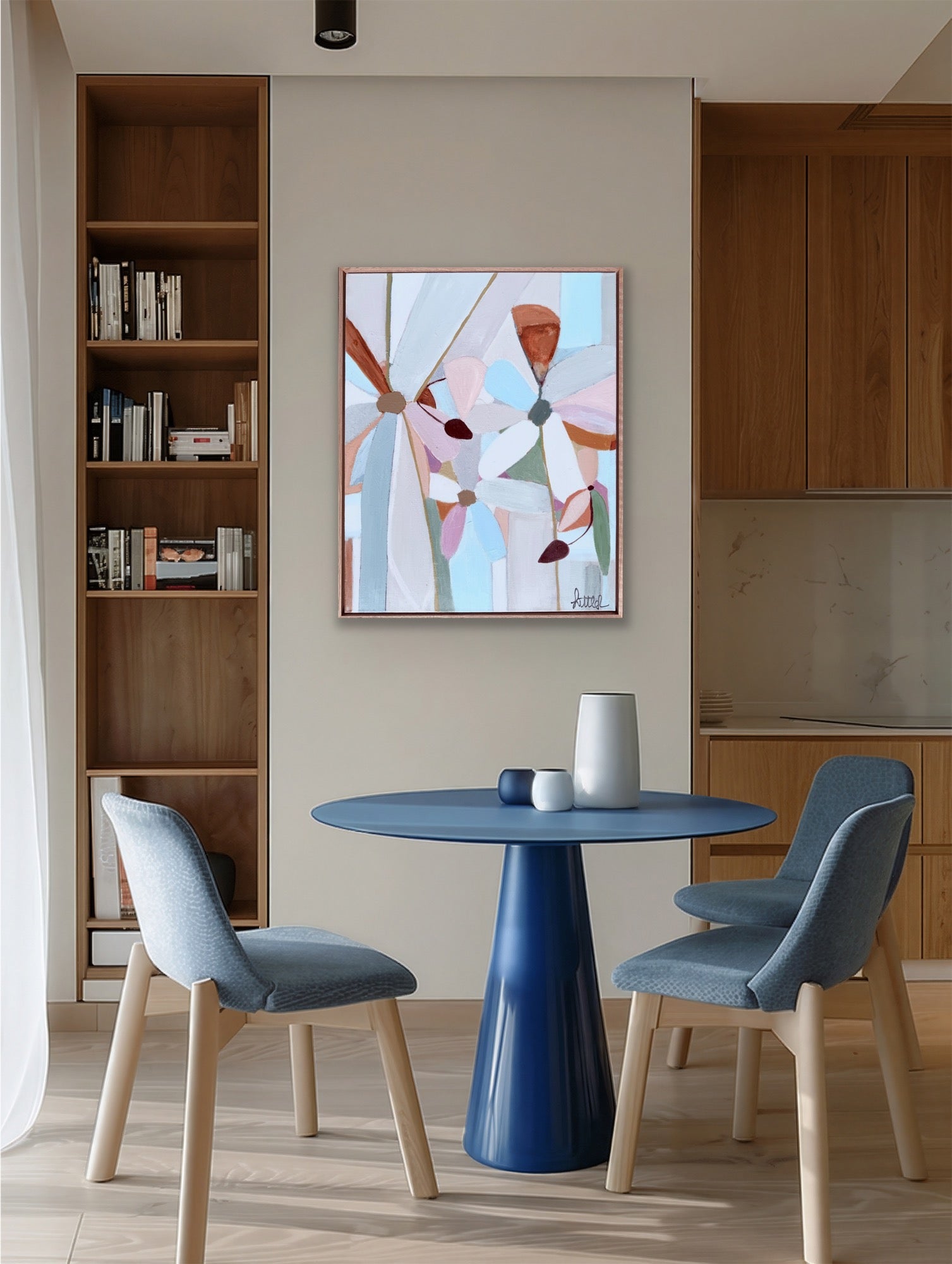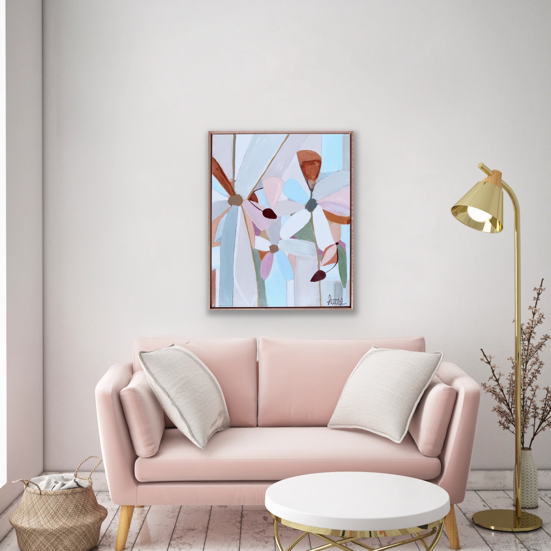 This captivating abstract floral painting presents a harmonious blend of soft pastels and earthy tones. The brushwork creates a dynamic interplay of shapes and colours, evoking a sense of gentle movement and tranquility. The subtle contrasts and fluid forms invite the viewer to explore the delicate balance between nature and abstraction. Perfect for adding a touch of elegance and serenity to any space, this piece is a timeless addition to your art collection.
