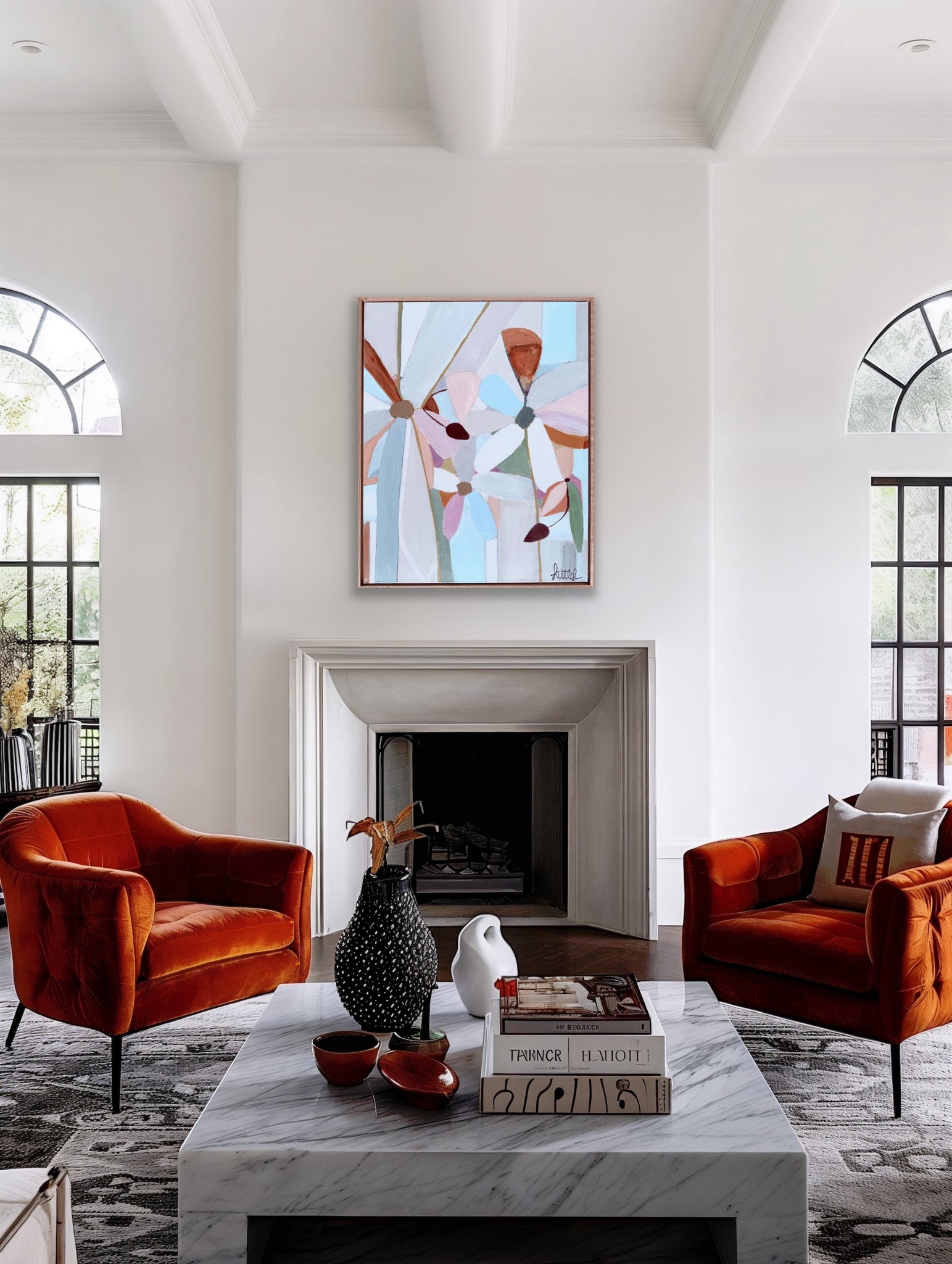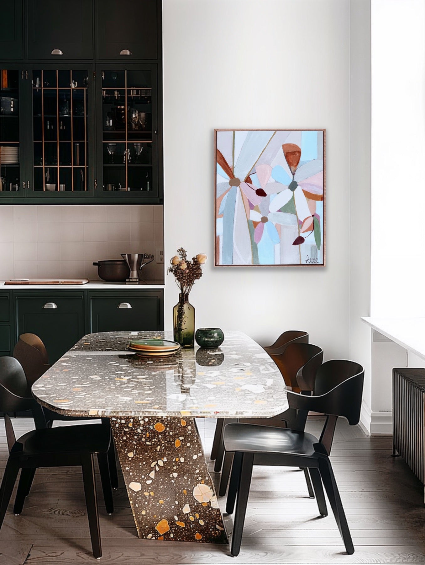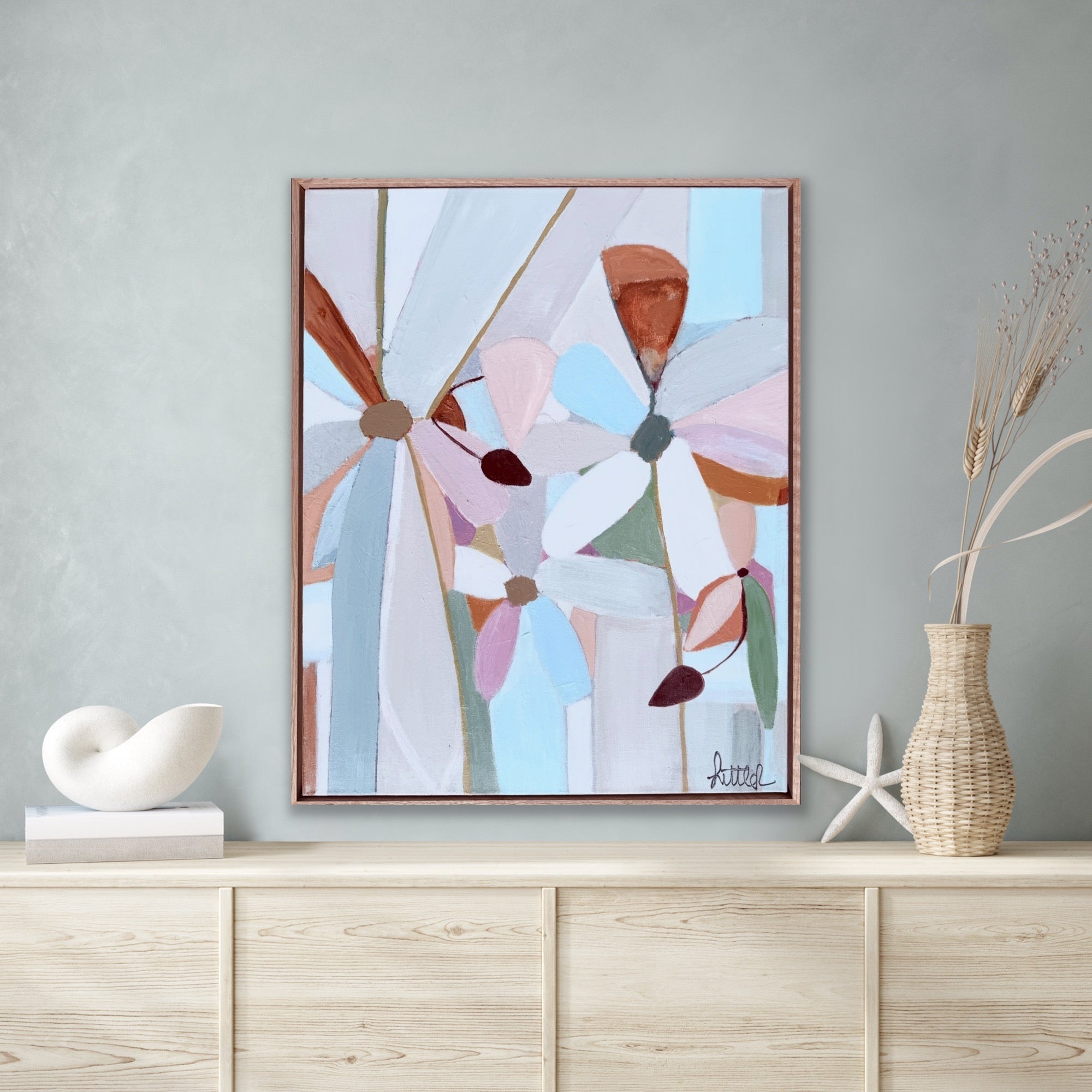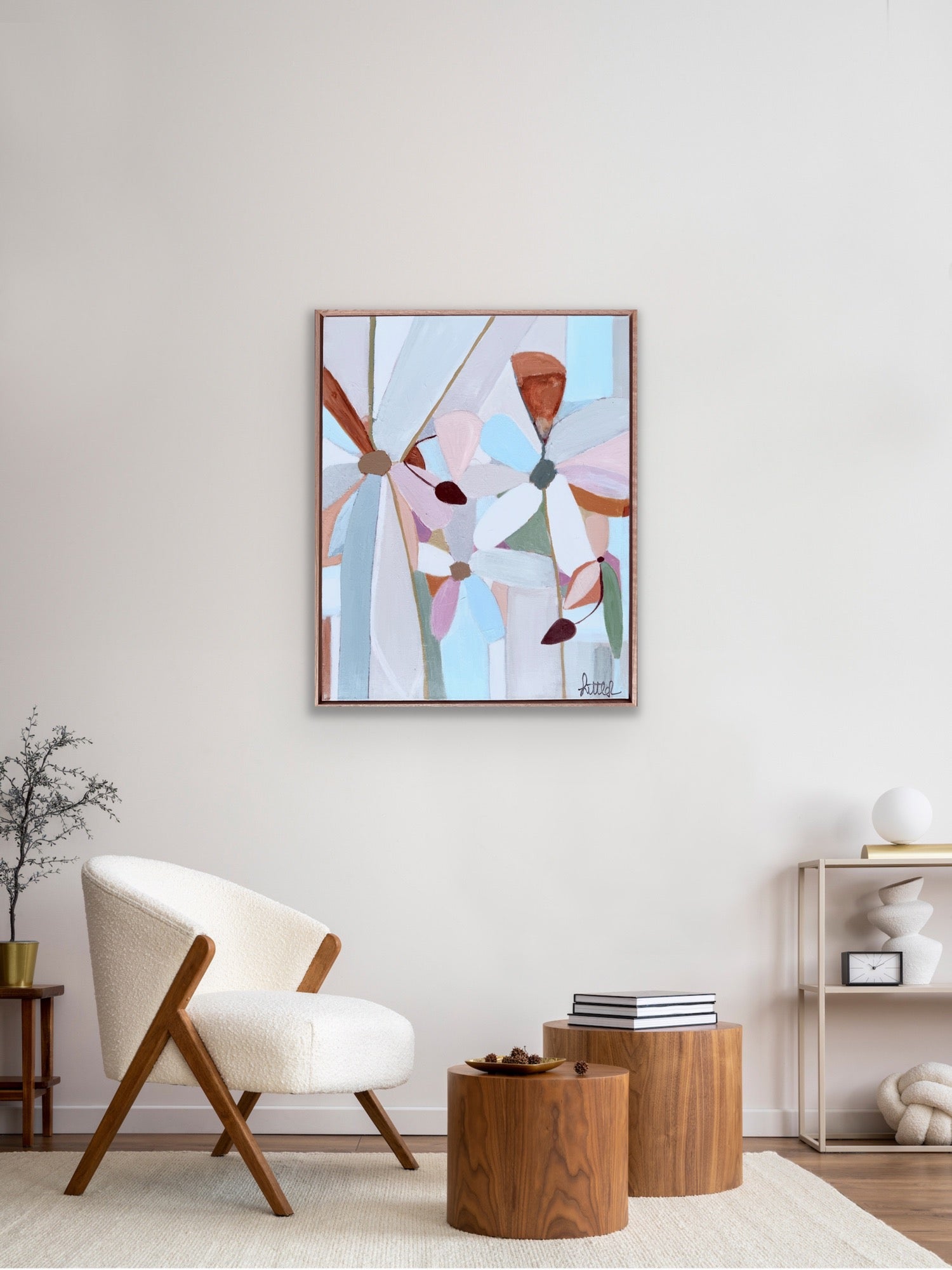 This captivating abstract floral painting presents a harmonious blend of soft pastels and earthy tones. The brushwork creates a dynamic interplay of shapes and colours, evoking a sense of gentle movement and tranquility. The subtle contrasts and fluid forms invite the viewer to explore the delicate balance between nature and abstraction. Perfect for adding a touch of elegance and serenity to any space, this piece is a timeless addition to your art collection.