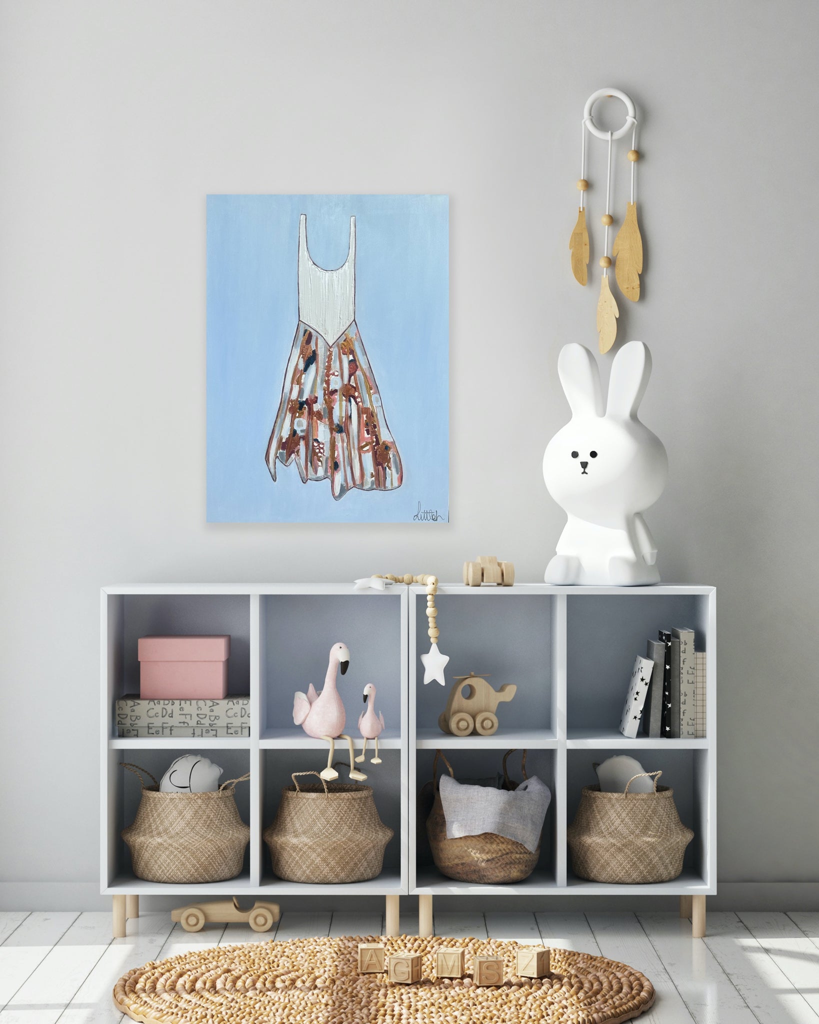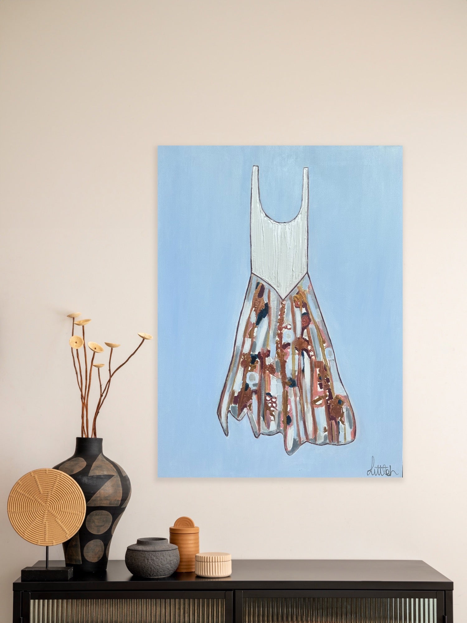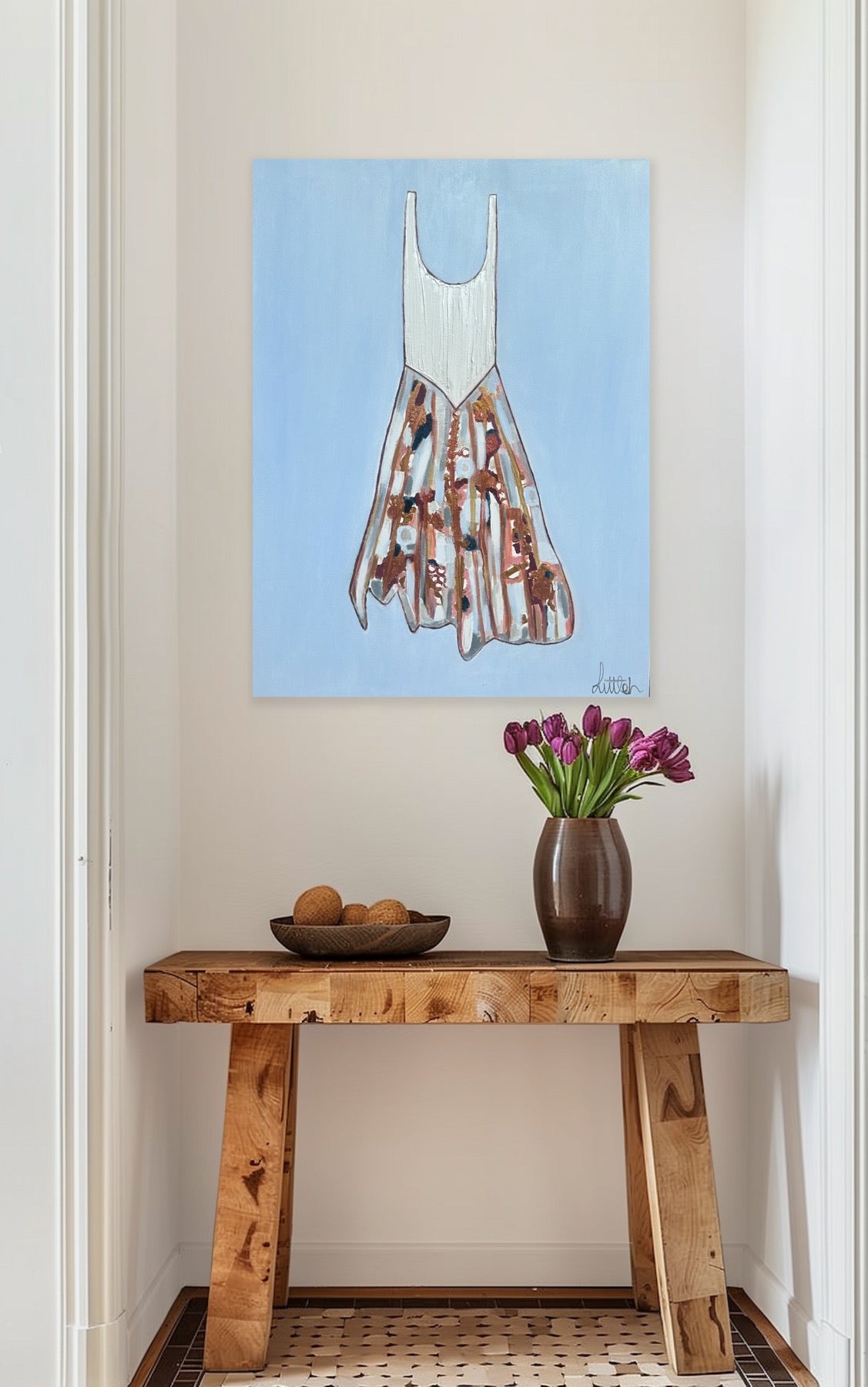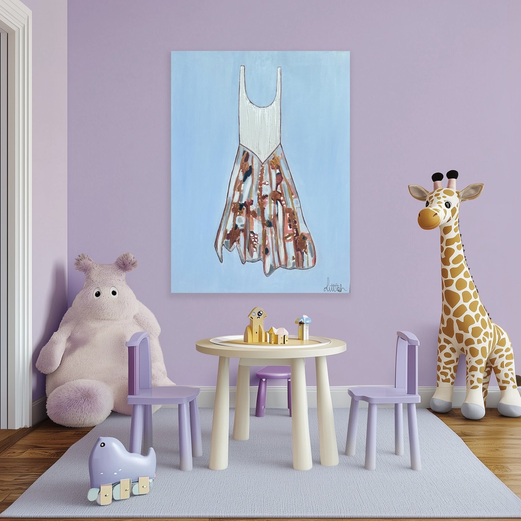 This dress brings together soft hues and playful patterns, creating a sense of elegance and whimsy.